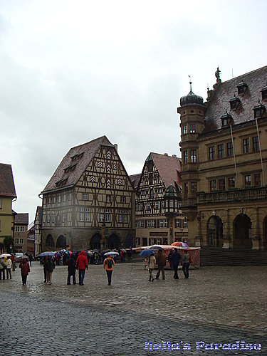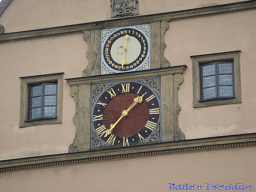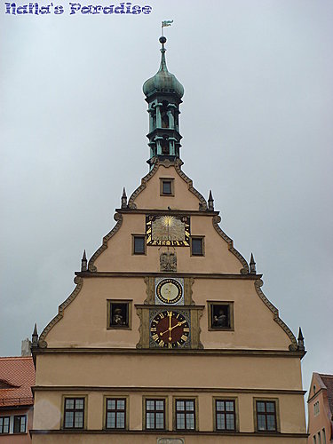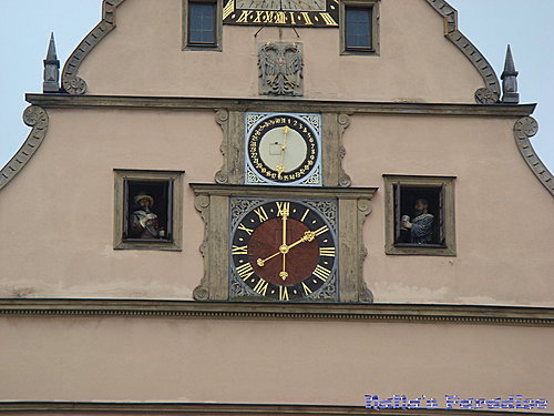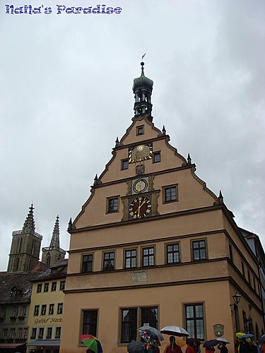 沿著羅曼蒂克大道駛去與古堡大道交接處的羅騰堡,除了保有中古世紀的古典風情外,建築物、城門及石頭拼湊起來的街道都令人難忘;參觀的起點是在市政廳的廣場前,一般的團體會在此解散好讓遊客們短暫享受著童話般的羅騰堡,廣場前有一個很特別的時鐘,每到上午11點、下午3點及晚上8點、10點,鐘左右兩邊的小門會在此時開啟,據說小門內的人物是描述1631年老市長盧修為了拯救羅騰堡免於被摧毀,喝下3.25公升葡萄酒的情景,而與其對飲的是當時的敵軍將領,他允諾若有人可以一口氣喝下這杯酒,羅騰堡便可免於災難,結果市長一口氣喝完的酒,令當時在場的敵軍將領目瞪口呆,也就了這個城市,為了紀念這件事情,羅騰堡還會定期位這歷史性的一刻特別舉辦活動。