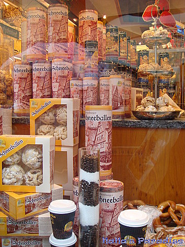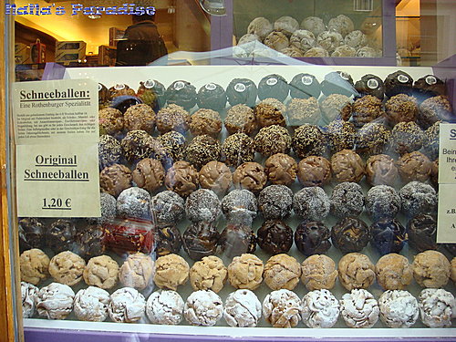 來到羅騰堡你不可不吃的就是『雪球』,不可不吃的原因並不是因為它很可口,單純的因為只有這裡吃得到,加上總是要試一試才知道那個東西到底是啥氣味;最便宜的雪球一個大約要€1.2,依雪球的口味有不同價錢,各式各樣的口味,主要的差異在於它包裹著不同的調味,なな所選擇的口味是外裹巧克力的,一個大約是€2.8左右,口感很特別,吃起來跟沙奇瑪口感相似,不過因為是甜的,所以吃多有點膩的感覺,這裡除了販售可以單點的雪球外,還有小顆包裝的雪球禮盒可供旅客選取。