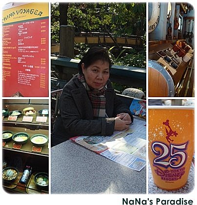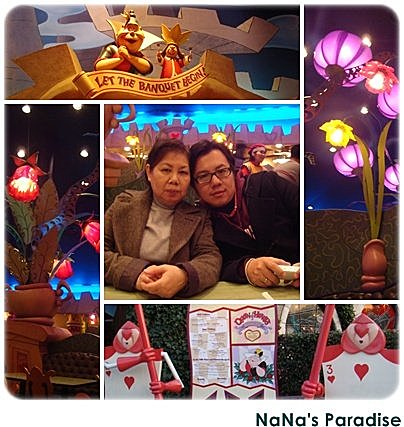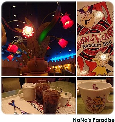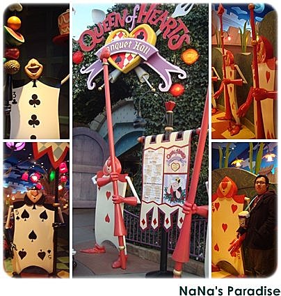 ↓ 愛吃的奈奈一家人度過一個開心、可愛的下午後來到同樣位在夢幻世界裡的『紅心女王宴會大廳 (Queen of hearts banquet hall)』休息片刻。這一間餐廳在樂園裡面算是很有特色的餐廳之一,也是奈奈最喜歡的餐廳喔!!...餐廳門口到點餐區都有站立在兩旁的撲克牌騎兵;另外,這裡的點餐方式是自助式的,有主食、輕食、甜點及飲料,不一定要在這裡用餐,簡單點個甜點及飲料...短暫享受一下這裡的一切感覺很棒呢!! ↓ 因為有兩位大娘同行,加上奈奈其實也不喜歡緊湊的行程,所以一路上吃吃喝喝到也在這裡消費不少;除了在China Voyage 及 Queen of hearts banquet hall 用餐外,還有什麼是漏網的餐點ㄋㄟ...在明日樂園的『明日樂園舞台餐廳 (Tomorrowland Terrace)』享用比較西式的輕食薯條、可樂;還有在世界市集裡買的甜點 (紀念杯子還可以帶回家當紀念品喔!!),最後是在沿路的小吃攤買的鮪魚派...每樣都很可口喔!! ↓ 曾經造訪過迪士尼樂園的遊客們應該都能體驗排隊排上大半個小時等待進場,每每一天能玩到遊戲頂多3~4個 (包含遊行及show),不管遊戲本身是不是吸引人...但這裡的快樂氣氛及事物真的讓人不自覺的愛上這裡,最後再來欣賞一下這裡白天與夜間的美麗囉!!