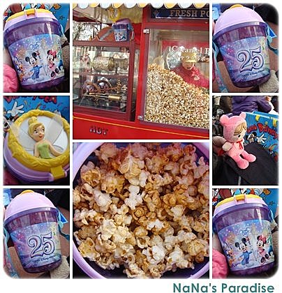 ↓ 等待的時間雖很難過 (因為要做在冰冷冷的地上)...所以這時候販賣的爆花米成為遊客爭相購買的點心了。在樂園裡都可以看到類似的攤位,有的賣肉桂棒、有的賣烤雞腿,再來就是最受歡迎的爆米花,不過要注意的是每處的爆米花口味不見得是一樣的喔!! (奈奈最愛是焦糖口味的爆米花);不同造型圖案的爆米花筒也相當應景。(這個爆米花筒現在在奈奈家的書房當垃圾桶喔!!...還有這次也帶著新夥伴嬰兒超人一同看遊行呢!!)