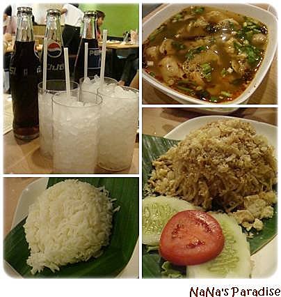 ↓ 炎熱的天氣當然要配上飲料消消暑氣啦!!...店家沒有可口的可樂,不過PESI也深得我心...四罐可樂並附上四杯加滿碎冰塊的杯子...看起就很消暑吧!! 餐點的部份要跟大夥介紹、介紹...右邊這碗湯湯水水的就是泰國最為知名的東央宮(不知道中文是怎麼翻譯的??)...這個味道大概也只有馬先生可以接受..."爆辣";下方這道是泰式炒麵,搭配上面的香鬆...和在一起的口感相當的奇妙。