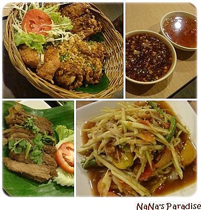 ↓ 奈奈超級推薦這裡的炸雞翅,味道也相當的美味...不用沾醬就很下飯(奈奈吵著要叫第二籃);左下的是燉豬肉,味道上較為清淡...是咱們在曼谷期間吃到最為清淡的一道菜了,沾上店家附上的醬汁...味道也挺不錯的呦!! 右下則是到泰國菜餐廳必點的青木瓜沙拉,泰國的青木瓜沙拉在味道上都比較重,所以不能吃辣又愛吃的夥伴...吃的時候可要當心,可別嗆到了喔!!