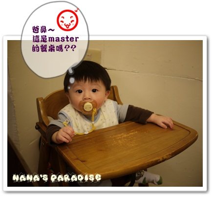 ↓ 8個月的master在餐廳可以自己坐椅子囉!!(還不太穩啦!!)...這時候仍要注意~容易滑下去。