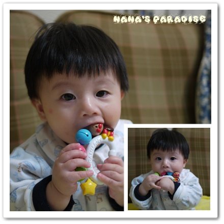 ↓ 再來就是狂嗑他的玩具了~不知道是不是要長小牙了,這陣子的master很愛啃硬硬的玩具;