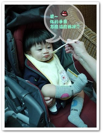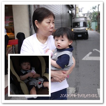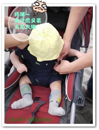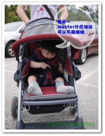 ↓ 還不清楚狀況的我們,先把master五花大綁的綁上娃娃車再說...雖然master是個不胖的寶寶,