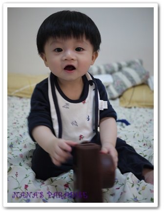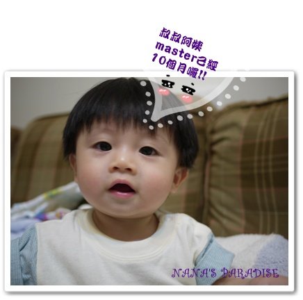 好快喔!!~master已經滿10個月囉!!這個月master的表現媽咪我只打70分,值得稱讚的是寶貝的副食品及奶量都有大突破(可是體重還是在8公斤以下),扣分的地方是很愛摸東摸西的...尤其是插座、窗簾之類,被爸鼻打屁屁都不知道乖一點;明明看master有長大,不過怎麼跟幾個表妹比起來還是感覺小小隻的~是因為好動把吃進去的好料都給消化了嗎??~不過媽咪我還是要給寶貝鼓勵、鼓勵喔!!