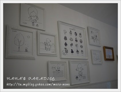 ↓ 牆上的圖畫並沒有太多的色彩,但一幅幅圖畫也豐富了這單調的白牆。