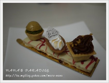 甜品上有著三種口味的點心,讓人一次可以有多種享受;底層的餅干口感相當酥脆。