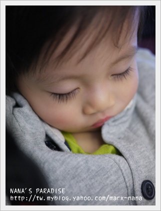 ↓ 吃完點心、玩了一頁的貼紙簿,master很大心的睡到爸媽把餐吃玩;應該是太早起了在補眠吧!!