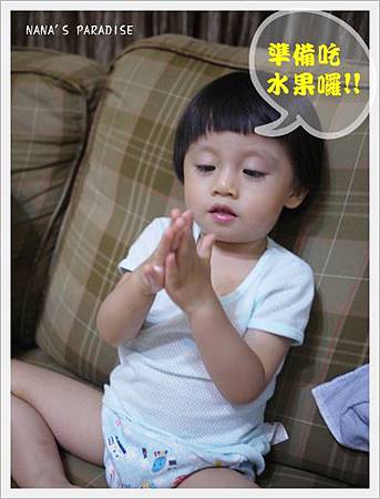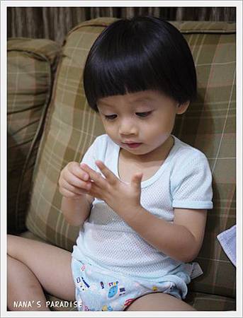 ↓很仔細在檢查手指縫還有沒有髒髒,潔膚水果不其然成為它的新玩物。