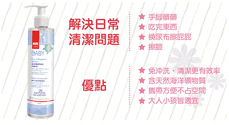 ↓現在"進食"前後都會給寶貝使用潔膚水清潔手部,