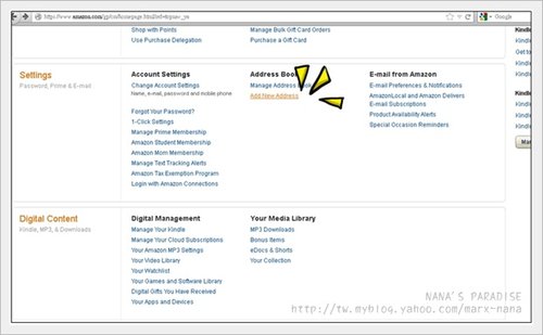 上圖選擇"My Account"後,在Settings找到"Add New Address",先設定一下收件的地址。