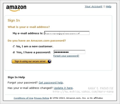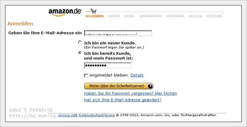 下一次登入時,不管是amazon.com或是amazon.de,只要登入下面的資訊就可以開始購物囉!!