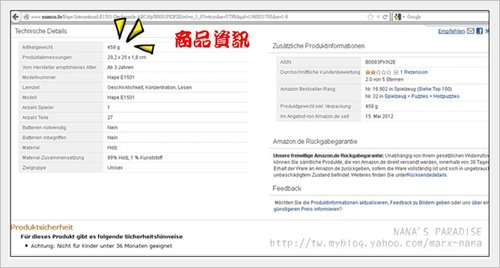 HAPE的木質拼圖因為是長方狀的,amazon.de採用了不一樣的包裝方式。