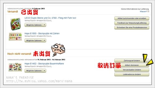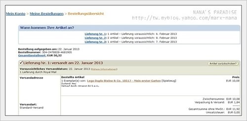 奈奈是在1月22日在amazon.de下單,而amazon.de將奈奈訂購的物品分批出貨(需要調貨)。